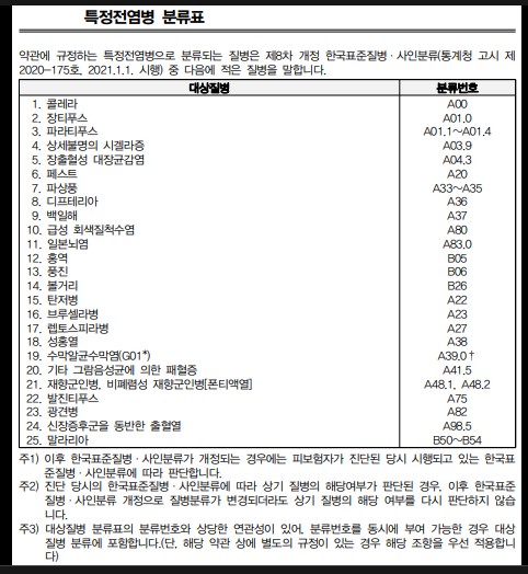 특정 전염병의 경우 약관에 분류되어 있는 질병에 한정하여 보상이 이루어집니다.
