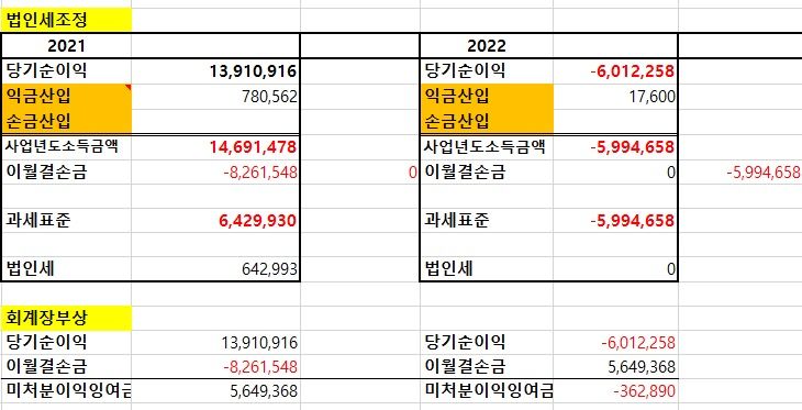 2022년도 이월결손금은 회계장부상으로 -362,890인데 법인세조정후 이월결손금은 -5,994,659인게 맞나요?