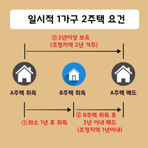 일시적 2주택 조건에 해당하기 위해서는 기본적으로 기존 주택의 취득일과 신규 주택의 취득일이 1년이상의 간격이 있어야 하고