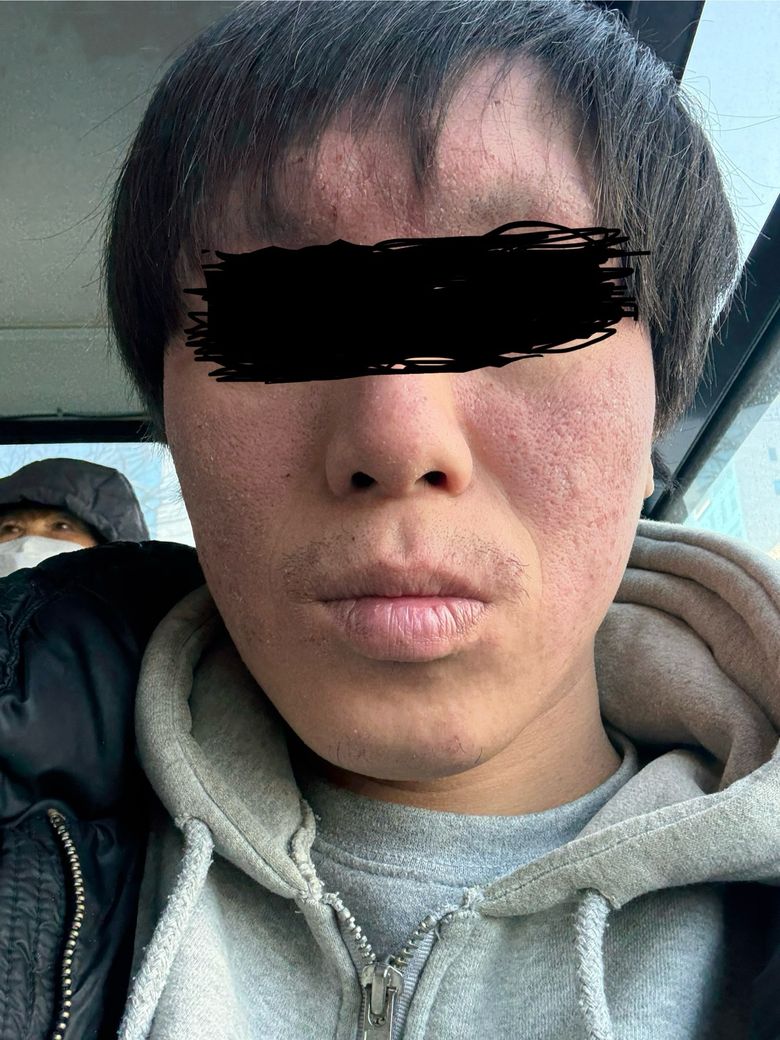 사진상 양측 볼에 모공이 깊게 패인 형태의 위축성 여드름 흉터(atrophic acne scar)가 뚜렷하고, 전반적 홍반과 피부결 불균형이 동반되어 있습니다. 활동성 여드름보다는 과거 염증성 여드름 이후 남은 흉터 병변으로 보입니다. 일부 홍조는 여드름 후 홍반(post-inflammatory erythema) 가능성이 있습니다. 단일 질환이라기보다는 여드름 후유증 상태로 판단됩니다.