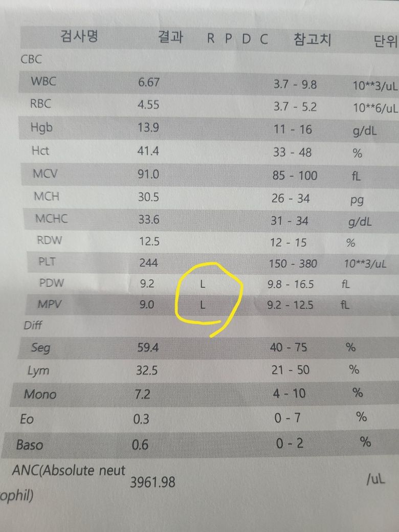 혈소판 관련 지표 (PDW, MPV): 혈소판의 크기와 분포 폭이 낮은 것인데 혈소판 카운트가 정상이기에 역시 임상적 의미는 크지 않습니다.