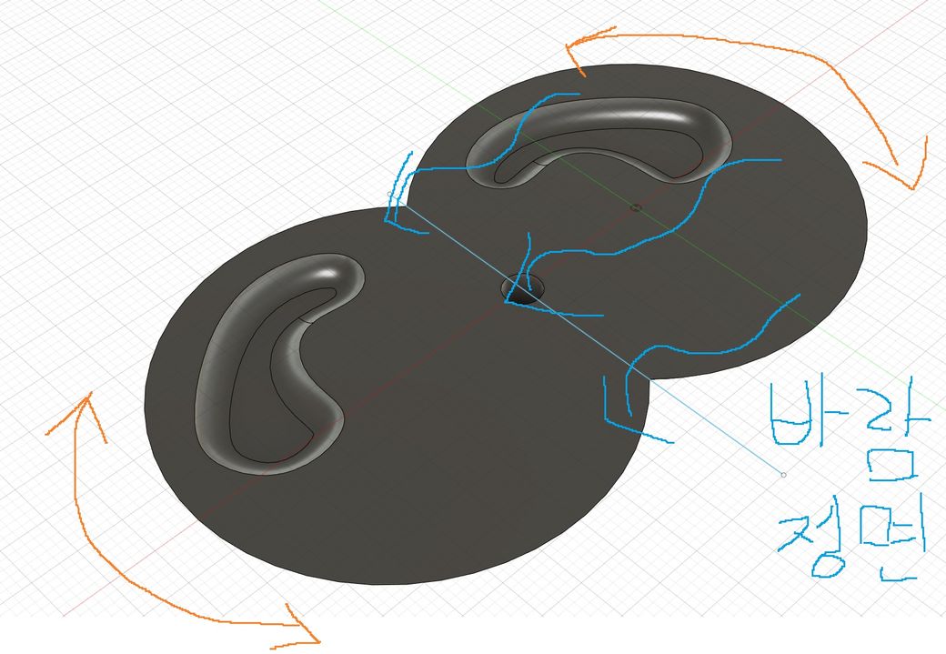 설계중이신 형상은 정면에서 바람을 받을시 힘의 방향을 바꿔주는 구조가 아니다보니 돌아가지 않을 것으로 보입니다. 홈의 옆부분에 구멍을 뚫으면 회전에 도움이 되지 않을까 싶습니다.
