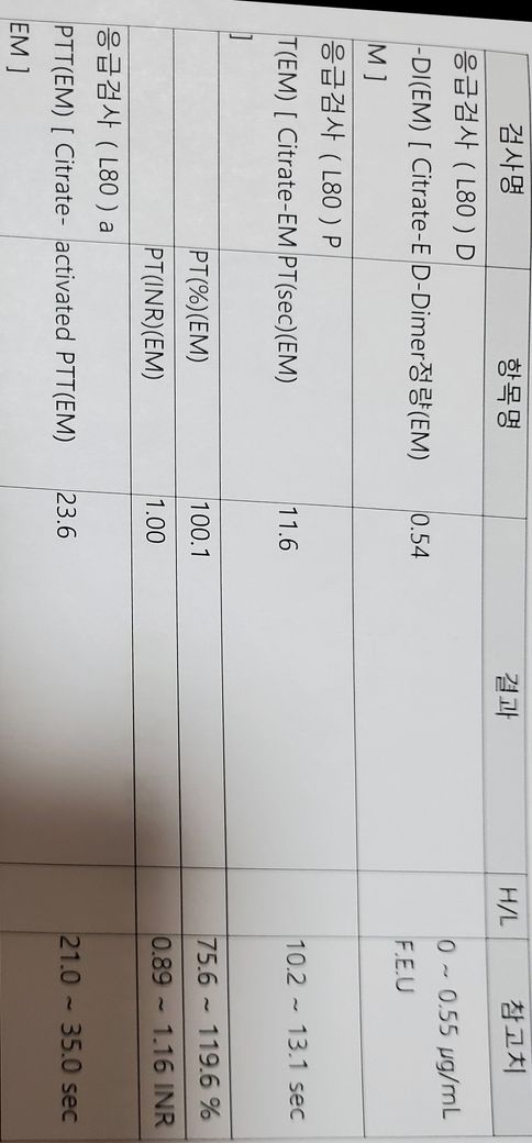 정상을 보였고 D-dimer 는 혈전 여부를 확인하는 수치인데 0.54로 정상 수치를 보이고
