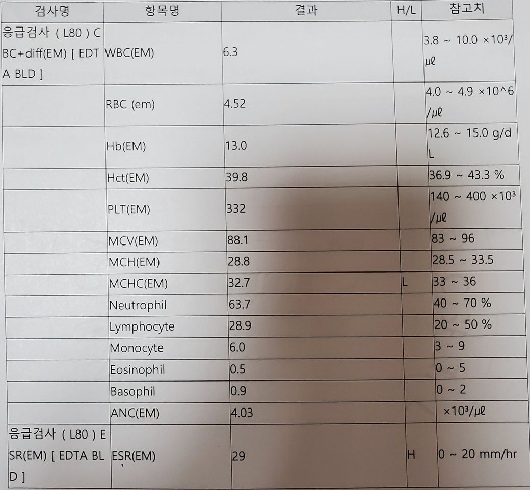 혈액 검사에서 일반 혈액 검사에서 백혈구 6300, Hb: 13.0, 혈소판: 332k 로 정상에