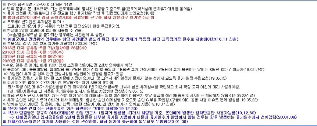 질문하신 내용에 대하여 아래와 같이 답변 드립니다.첨부하여주신 '휴가에 대한 내부 문서'의 내용이 제대로 보이지 않는 바, '근로계약서'의 내용만을 살펴보겠습니다. 근로계약서 6-(2)의 내용에 대한 근로기준법 상 규정은 아래와 같습니다.