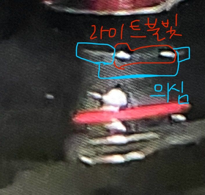 블랙 박스를 찍은거라 화질이 안좋긴한데 사진 상 빨간색 부분이 제 차 라이트 부분으로 보이고, 파란색 부분이 제가 애매하다고 말씀드린 부분인데요