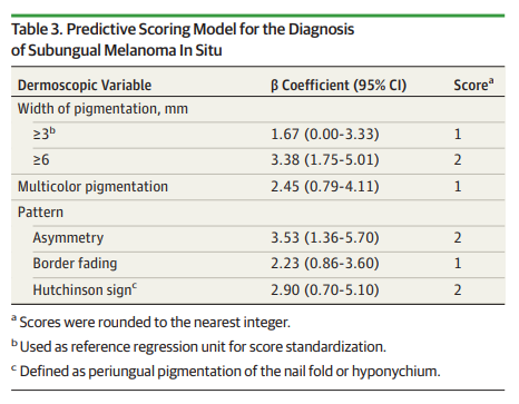 Ohn, J., Jo, G., Cho, Y., Sheu, S. L., Cho, K. H., & Mun, J.-H. (2018). Assessment of a Predictive Scoring Model for Dermoscopy of Subungual Melanoma In Situ. JAMA Dermatology, 154(8), 890.