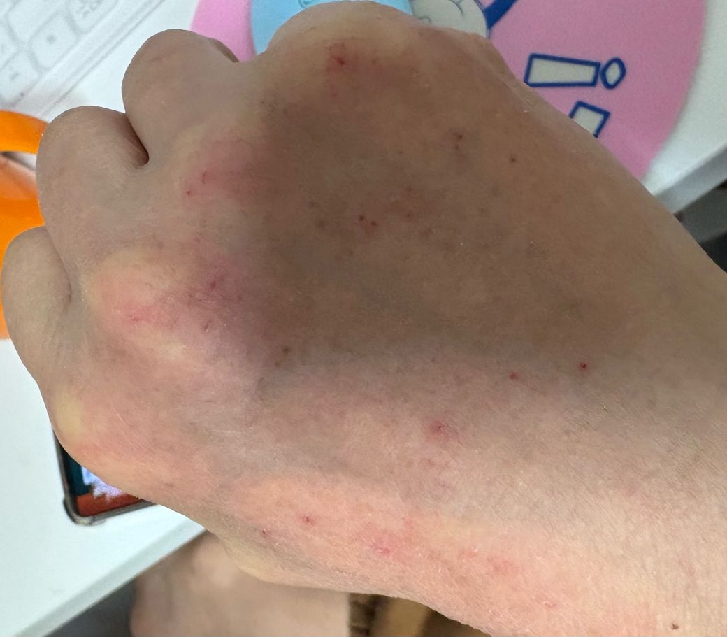 손등에 보이는 작은 붉은 점들은 미세한 염증이나 긁힘에 의한 모세혈관 자극 소견으로 보이며, 현재 사진상으로는 위험한 피부 질환 소견은 뚜렷하지 않습니다. 다만 오래 지속되면 만성 습진으로 고착될 수 있습니다.