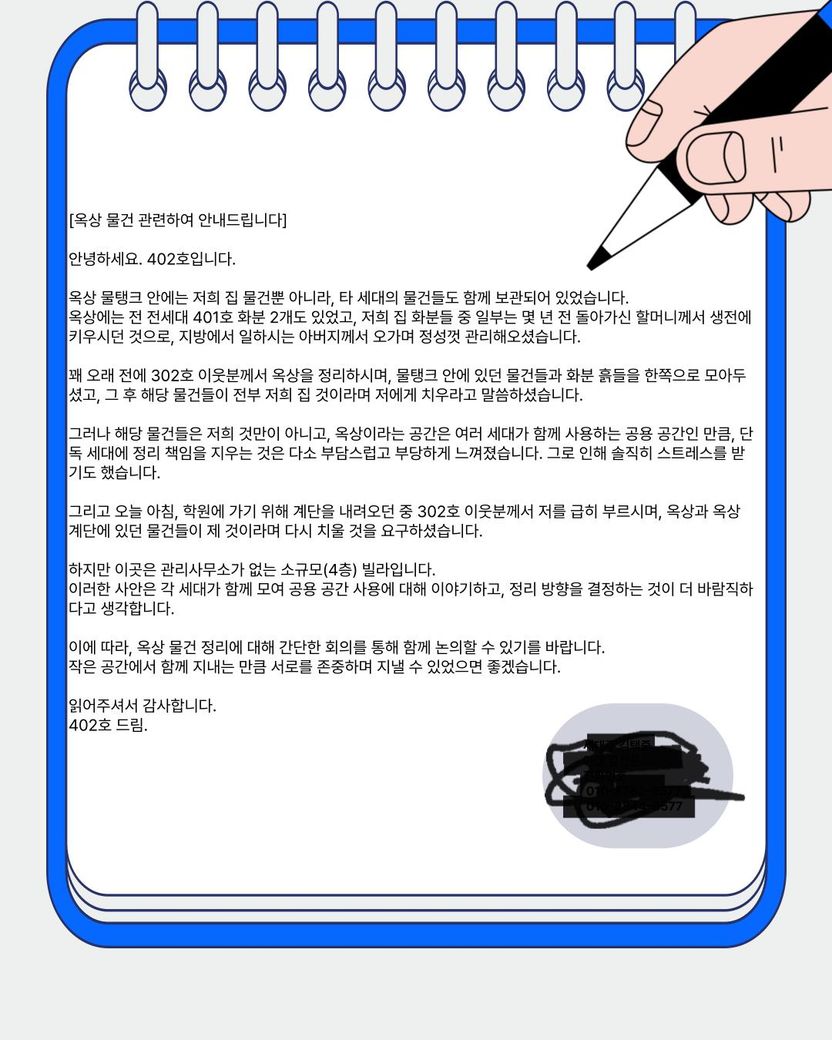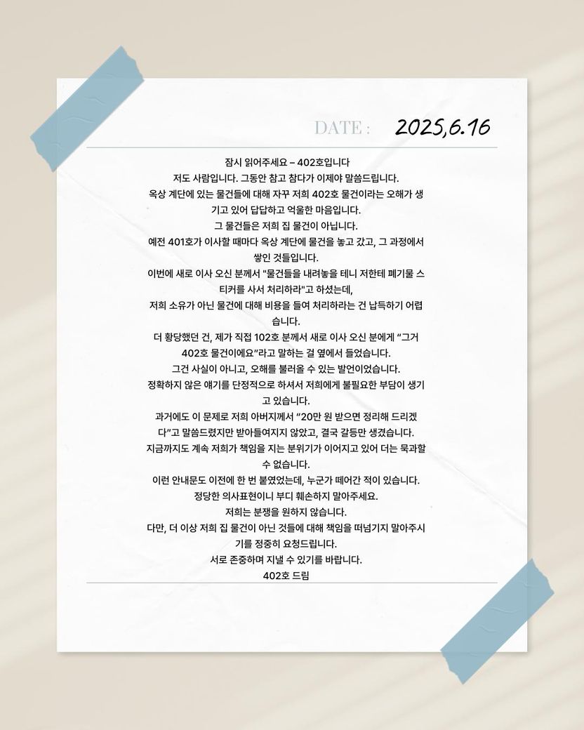 얼마 뒤 새로 401호 분이 이사를 오셨는데, 옥상이 너무 지저분하다며 저에게 오셨습니다. 십만 원이든 십오만 원이든 내줄 테니 저와 함께 옥상 물건들을 치우자고 하셨습니다.