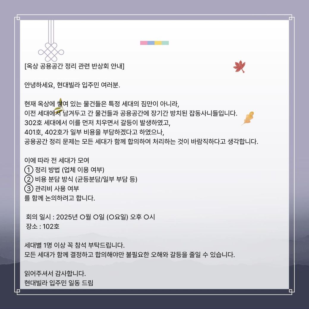 저는 폐기물 처리하는 곳도 알아보고 30만 원을 제가 지불하겠다고까지 했습니다. 그런데도 반상회를 하자는 이야기만 하실 뿐입니다.