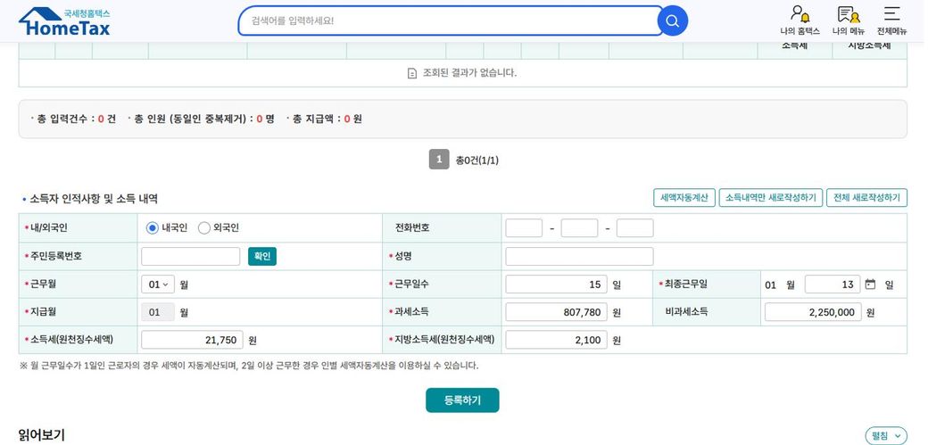 일용근로소득 간이지급명세서 신고 (홈택스)
