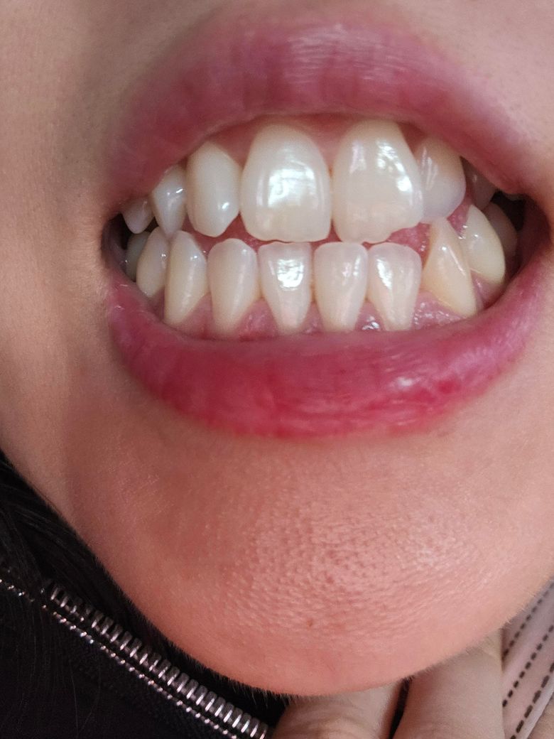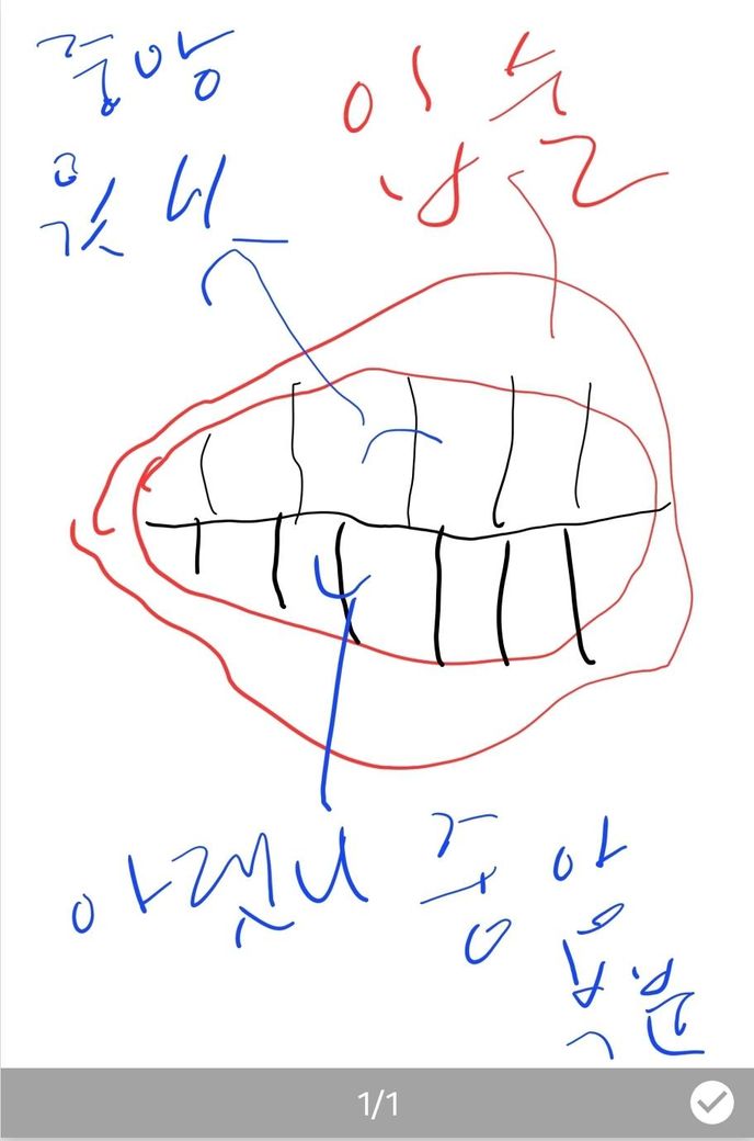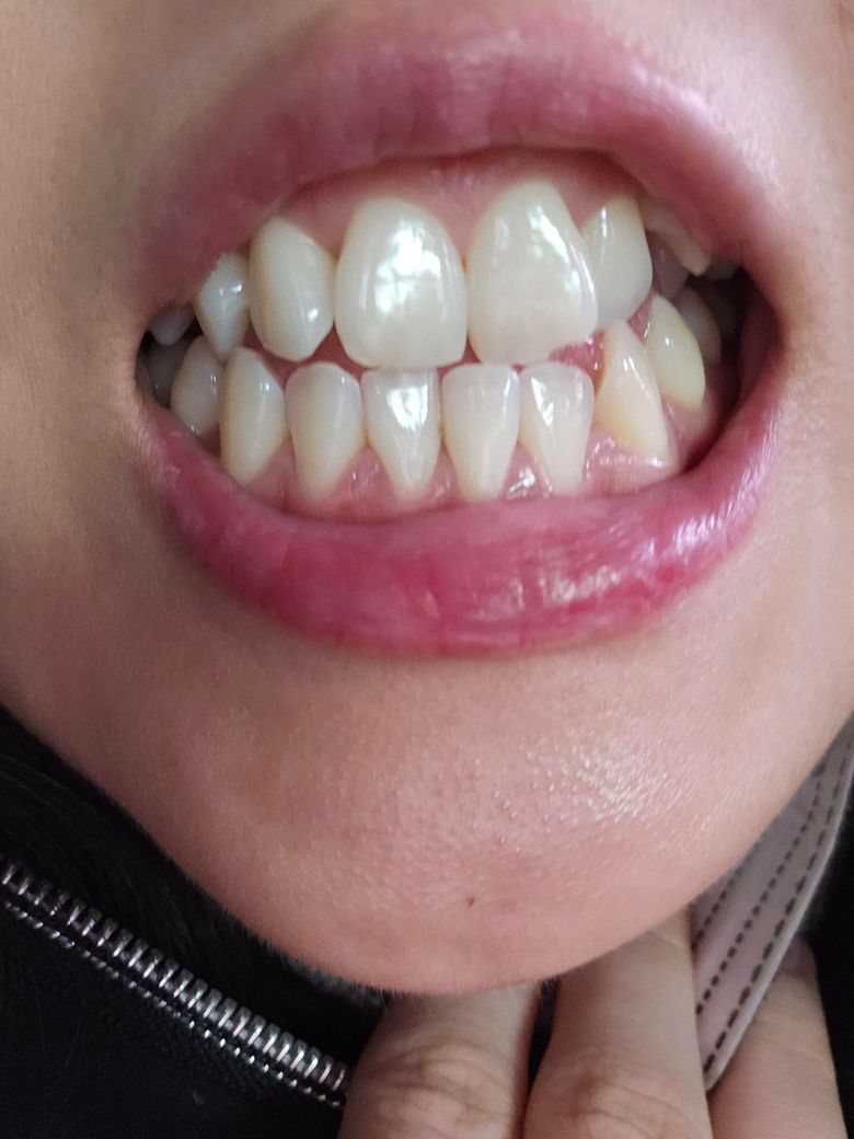 제가 부정교합이 있는데 아랫턱이 약간 주걱턱에 왼쪽으로 틀이져있어 이를 물었을때 윗니와 아랫니가 사진처럼 되어있어요.
