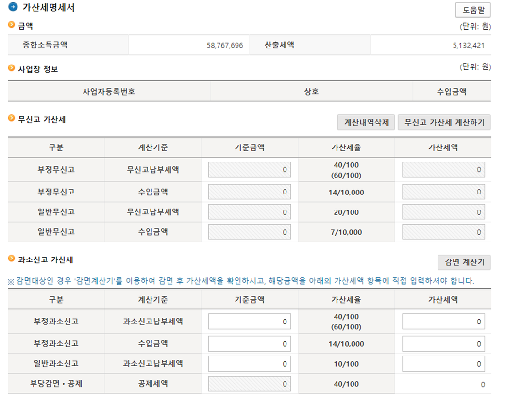 감면 계산기로 감면 계산 50%로 적용하고 나서 나온 금액을 일반과고신고 - 가산세액에 입력하고 저장, 다음으로 넘어가면 맞는건가요?