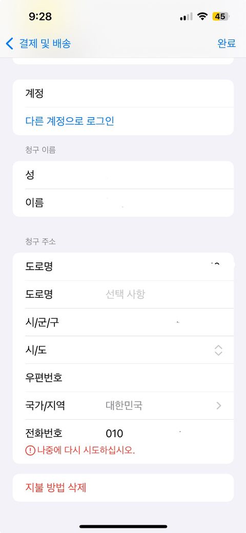 아이폰 결제수단을 카카오페이로 설정했는데 한달 정도는 잘 사용하고 있었습니다. 근데 갑자기 며칠전부터 결제가 안되더니 앱스토에서 앱 설치하는것 조차도 안됩니다 ㅠ 배송지 주소랑 청구정보가 잘못되었나 싶어 몇번이고 바꿔봤는데 전화번호 밑에 ㅁ빨간 글씨로 ‘나중에 다시 시도하십시오’ 라고만 뜹니다 어떻게 해야하나요 ㅠ