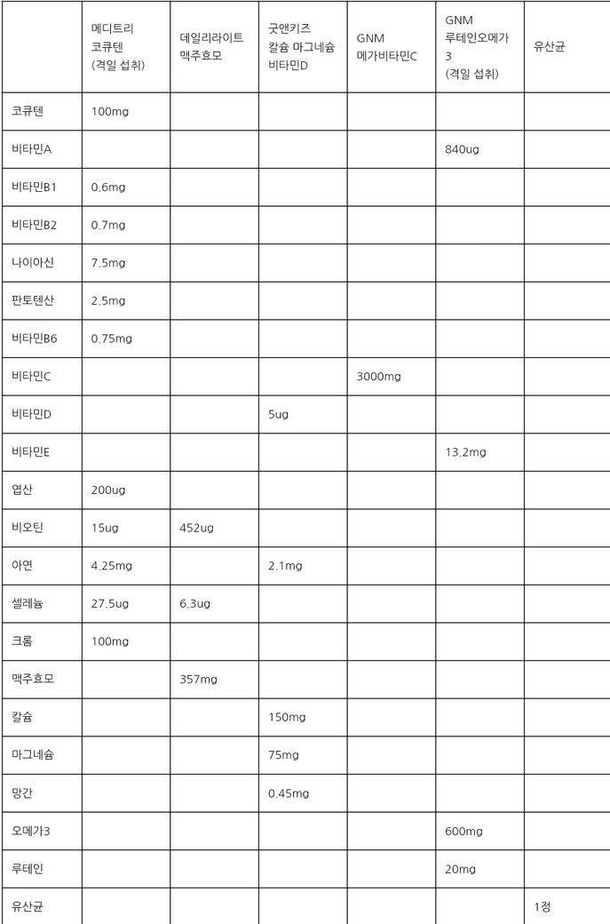 하루에 많이 먹기힘들어서 몇몇 영양제는 격일로 먹고있어요.