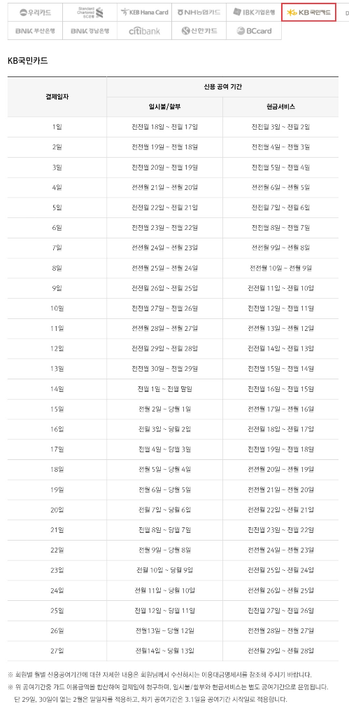 네이버에서 국민카드 결제일을 검색하시면 각 결제일에 맞춰 기준이 표로 작성되어 있습니다.
