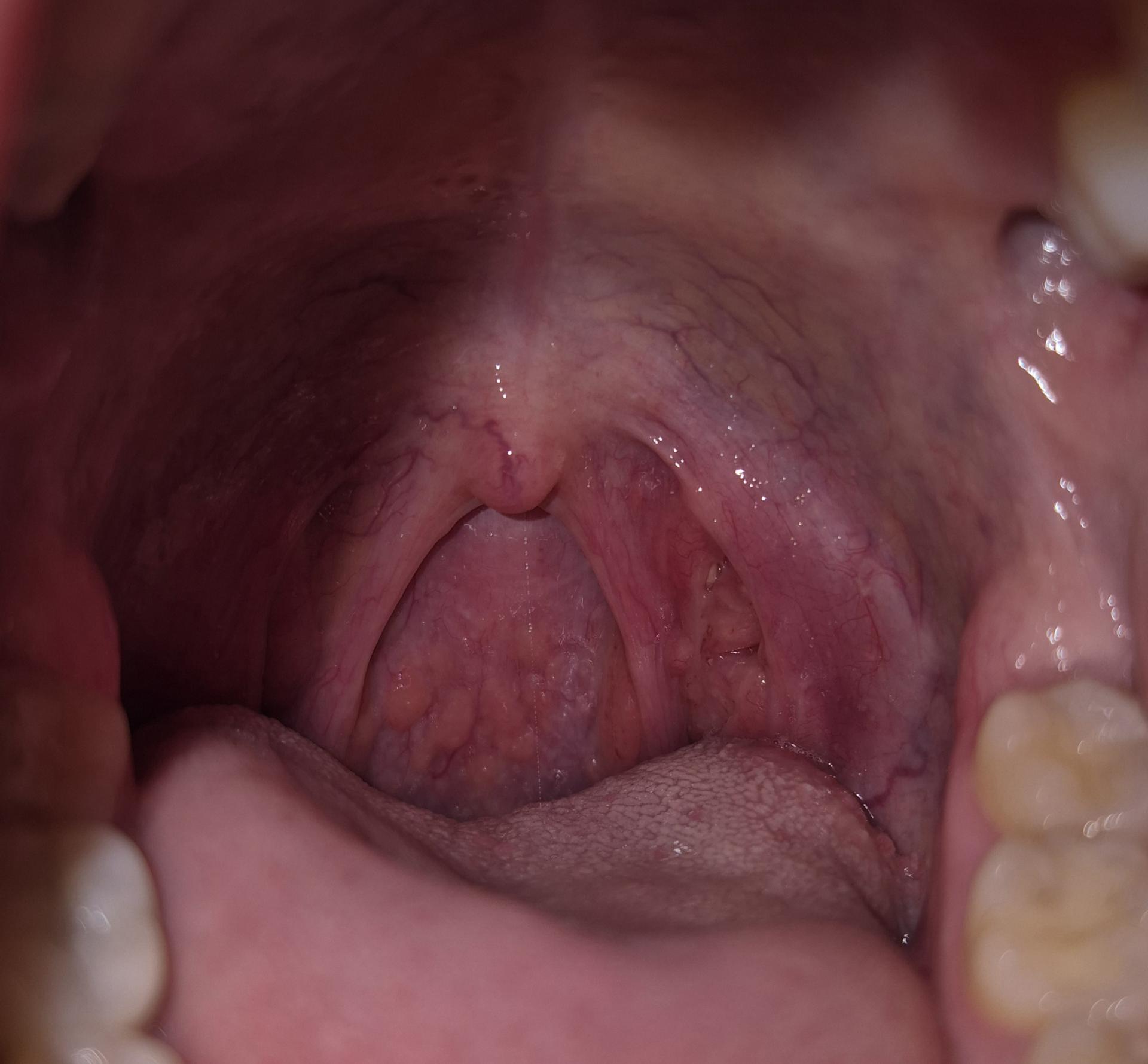 질문이 정확히 어떤것인지는 모르겠으나 사진에 대한 것이라면 5번째 사진을 기준으로 보았을 때 좌측 편도 아래측에 약간의 흰 삼출물이 보이며 삼출물은 염증이 있음을 시사합니다. 편도 윗부분에 파인 부분 안에 있는 흰 부분은 편도결석 가능성이 있습니다. 불편하신게 있으시면 가까운 내과 이비인후과 등에서 진료 보시면 되겠습니다.