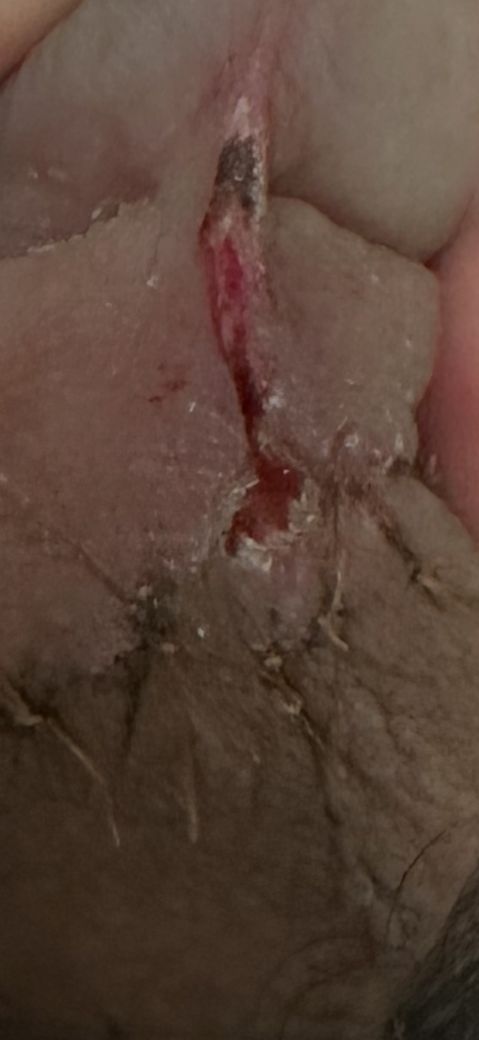 다만 고름이 뚜렷하게 고여 있거나, 절개선 주변으로 광범위한 발적·부종·열감이 심하게 퍼진 모습은 사진상 뚜렷하지 않습니다. 즉, 응급 상황으로 보일 정도의 중증 감염 소견은 아니지만, “호전 없이 지연 치유되는 국소 염증 또는 부분 창상 감염” 가능성은 충분히 있습니다.