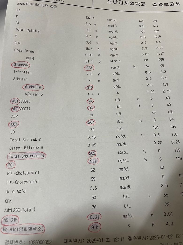을 했고, 12월 28일부터 금주하고 2025년 1월 2일에 혈액검사 결과 다음 사진과 같이 나왔습니다.