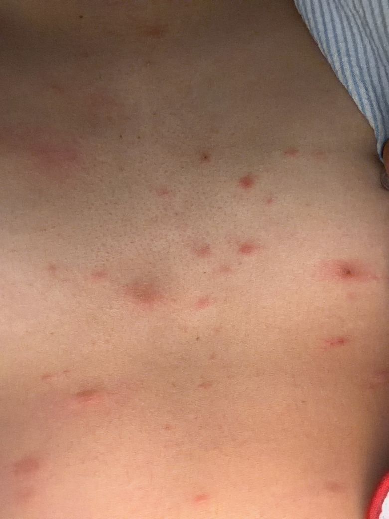 저번주 일요일부터인지 기억이 잘 안나지만 가슴쪽, 아랫배, 등 부분에 사진처럼 두드러기가 나고, 간지럽고 목이랑 다리, 겨드랑이, 팔로 퍼지는 것 같아서 무서워요.