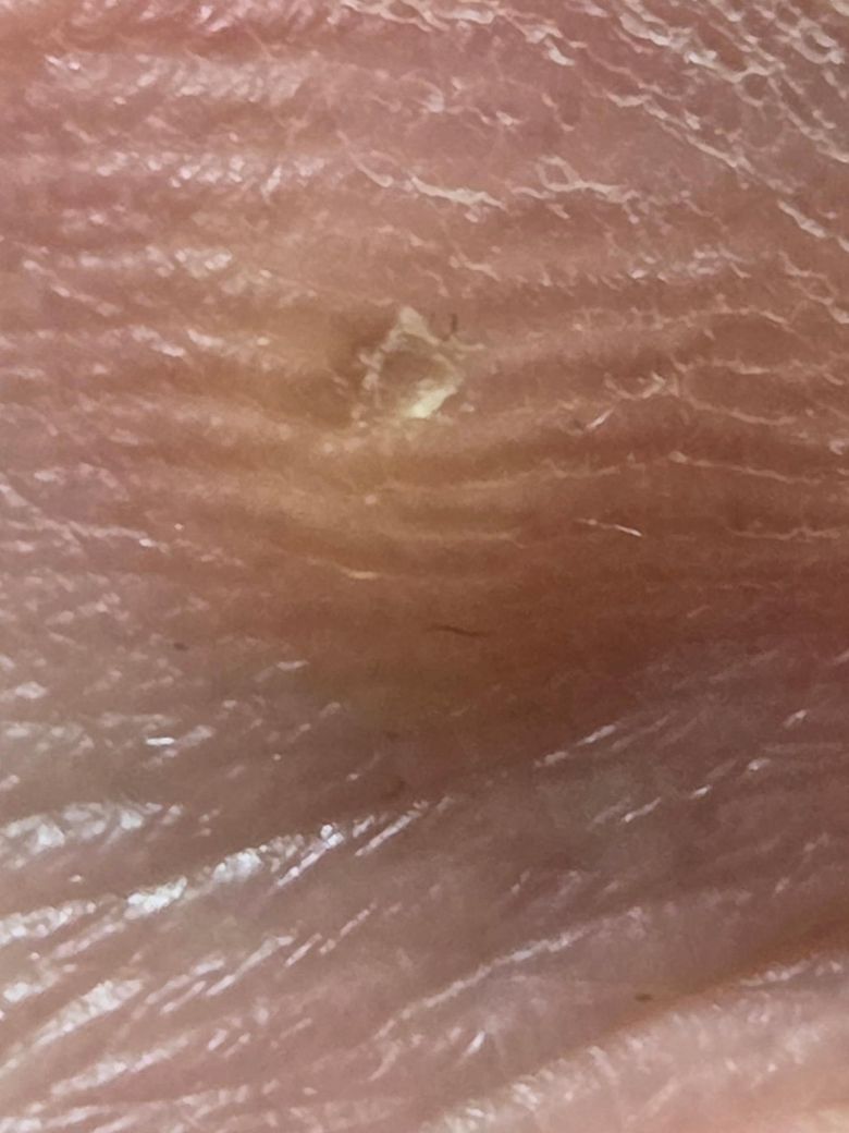 사진상 병변은 중심부에 각질성 핵이 있고 주변이 비교적 균일한 각질로 둘러싸인 형태입니다. 표면이 거칠게 융기되거나 점상 출혈(검은 점) 소견은 뚜렷하지 않습니다. 이 소견은 사마귀보다는 티눈(압박성 각화증)에 더 합당합니다.