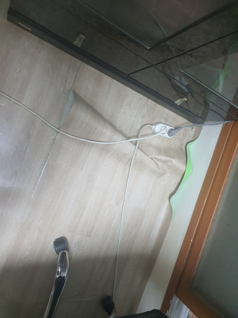 장판의 길이가 너무 긴것 같은데요. 좀더 절단을 하시는게 좋을듯 합니다. 그리고 뒤에 의자가 있어서