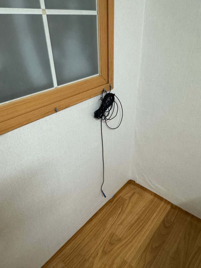 이 선은 아마도 전화선이나 인터넷선일 가능성이 높아요. 전에 살던 사람이 철거를 안하고 간것 같네요.