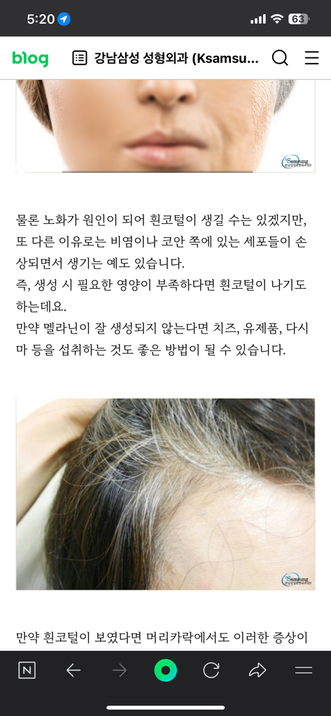 보신 글과 같이 비염으로 인해 콧털 자체가 흰색으로 바뀌는 경우도 드물게 있는 편이긴 하며, 균형잡인 영양소 섭취 및 수면 습관, 적절한 습도 유지 등을 통해 비염을 완화하는 방향으로 치료를 해보시면 호전될 가능성이 있습니다. 노화로 인한 부분이 아니라면 생활환경 변화로도 털 색깔은 변경될 수 있습니다.