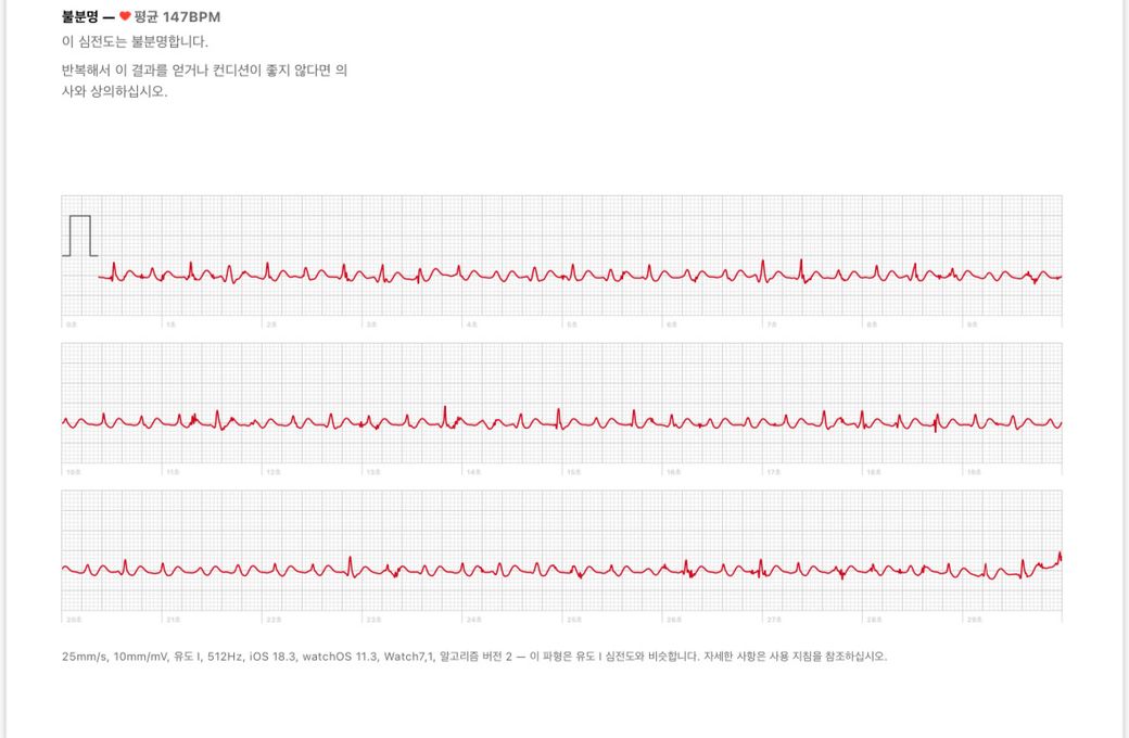 심장이 너무 빨리 뛰고 숨이 잘 안쉬어져서 애플워치로 심전도를 찍었는데 불분명이 떴어요 ㅠㅠ 심전도 분석 부탁드립니다 ... ㅠㅠ