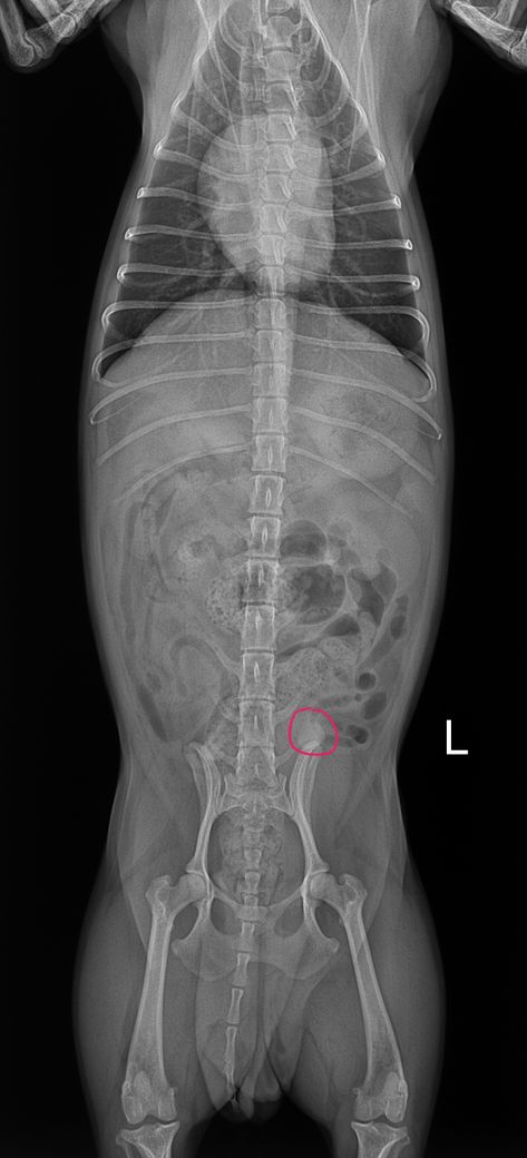 8살 암컷 강아지이고 어제 유선종양이랑 중성화 수술했는데 수술 전에 찍은 엑스레이에서 궁금한 점이 생겨 물어봅니다 혹시 엑스레이 상에서 제가 빨간색으로 동그라미 친 부분이 뭔 지 알 수 있을까요? 정확하게능 아니더라도 가늠이라던지 한번만 봐주세요..
