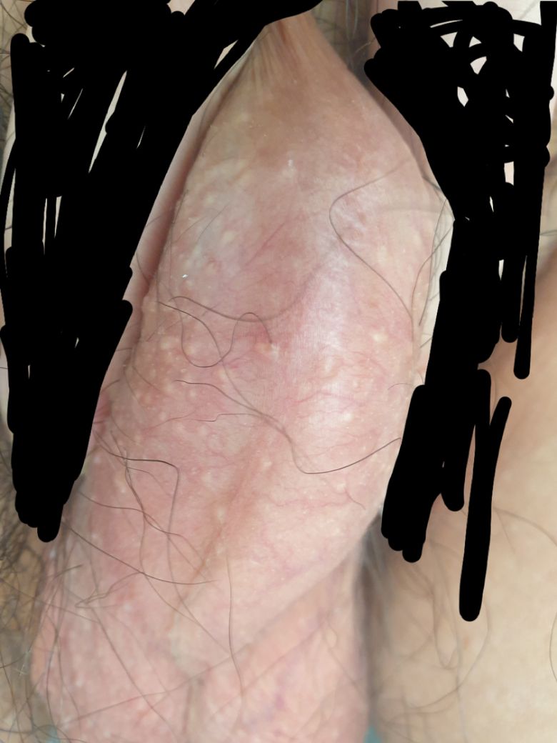 현재 병변은 포다이스반을 감별할 필요가 있어 보입니다. 포다이스반은 모낭이 없는 피지선이 커진 것으로 일반적으로 큰 치료등을 요하는 병변은 아닙니다. 하지만 정확한 진단을 위해서는 내원하시어 진료를 받아보시는 것이 좋겠습니다.