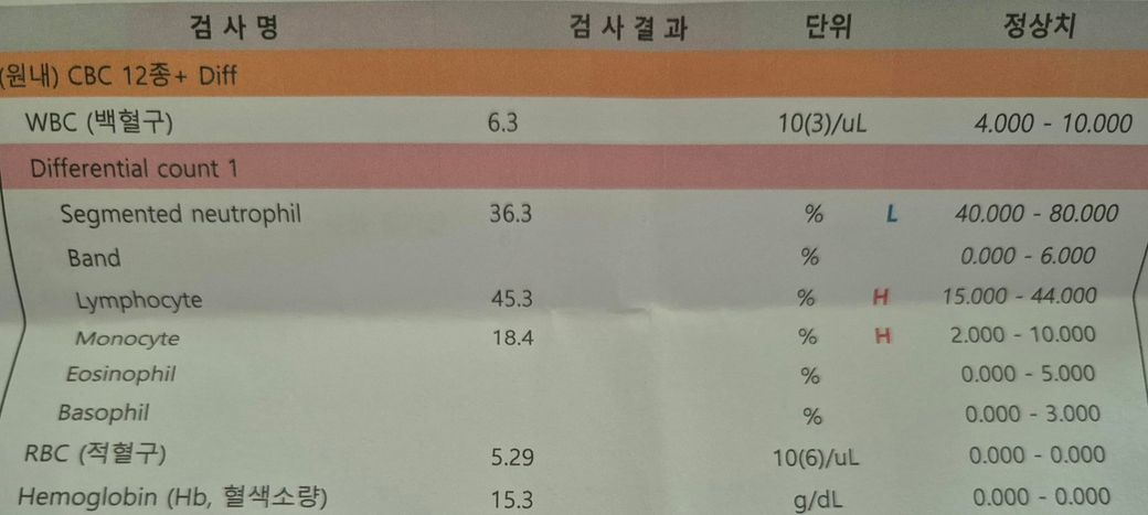 피검사 결과에서 파란색 'L'은 'Low'를 의미하며, 검사 수치가 정상 범위보다 낮다는 것을 나타냅니다. 반면 빨간색 'H'는 'High'를 의미하며, 검사 수치가 정상 범위보다 높다는 것을 나타냅니다. 사진 속 검사 결과를 보면 백혈구(WBC) 수치는 6.3로 정상 범위(4.0-10.0) 안에 있으며, 분절형 호중구(Segmented neutrophil)는 36.3%로 정상 범위(40.0-80.0)보다 낮아서 'L' 표시가 있습니다. 림프구(Lymphocyte) 수치는 45.3%로 정상 범위(15.0-44.0)를 초과하여 'H'로 표시되어 있고, 단핵구(Monocyte)도 18.4%로 정상 범위(2.0-10.0)를 초과하여 'H'로 표시되어 있습니다. 적혈구(RBC) 수치와 혈색소(Hemoglobin)는 각각 5.29 x 10^6/uL와 15.3 g/dL로 정상 범위 안에 있습니다