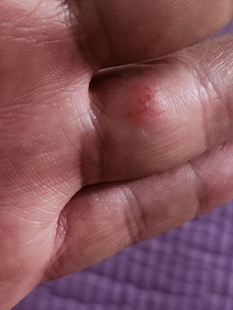 손가락에 이상한 수포 같은게 갑자기 며칠전 생겼습니다.가렵거나 통증이 있는거는 아닌데 이게 뭔가요??? 답변부탁드립니디ㅡ.
