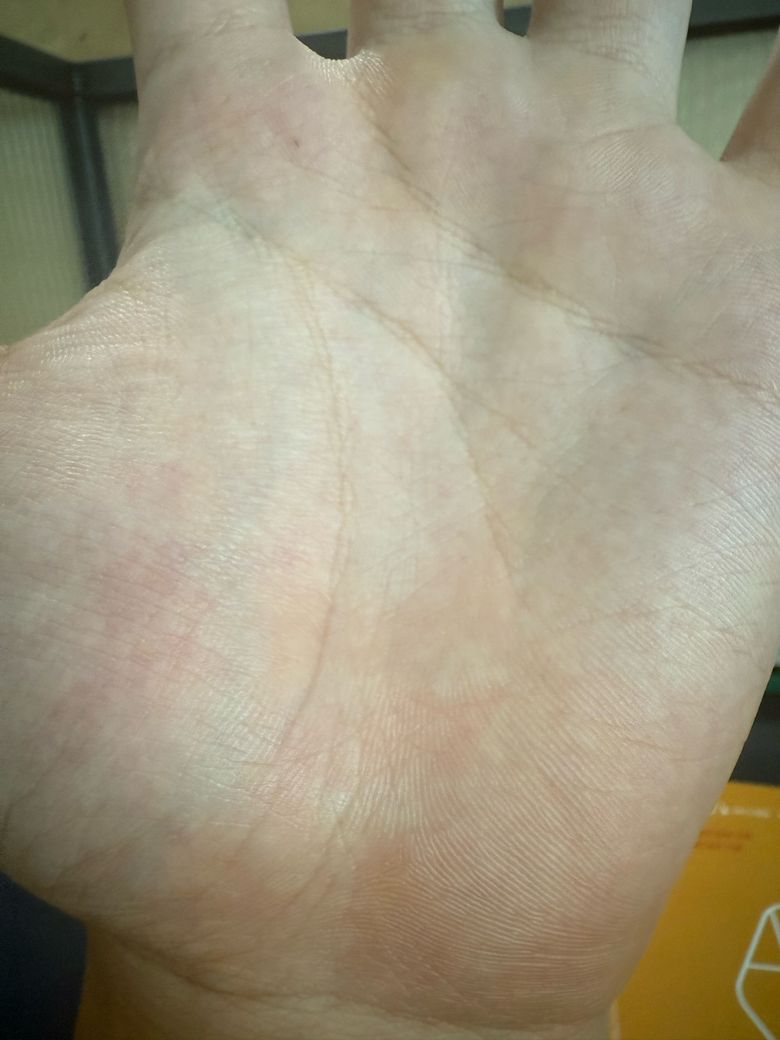 최근 가슴 밑에 쪽에 땀띠처럼 뭐가 나서 불안해 하고 있다가 애보트 매독 자가키트와 오라퀵 자가키트를 사용하였고 다 음성이 나왔습니다. 그런데 요즘 손바닥이 간지러운 증상이 자주 일어나거나 팔이 아픈 경우가 많아서 좀 불안하네요 혹시 제 손에 이상이 있나요? 아 그리고 엉덩이 팬티 라인이나 양말 라인쪽에 두드러기가 같은게 생기기도 하는데 자고 일어나면 가라앉아 있습니다;;