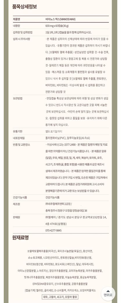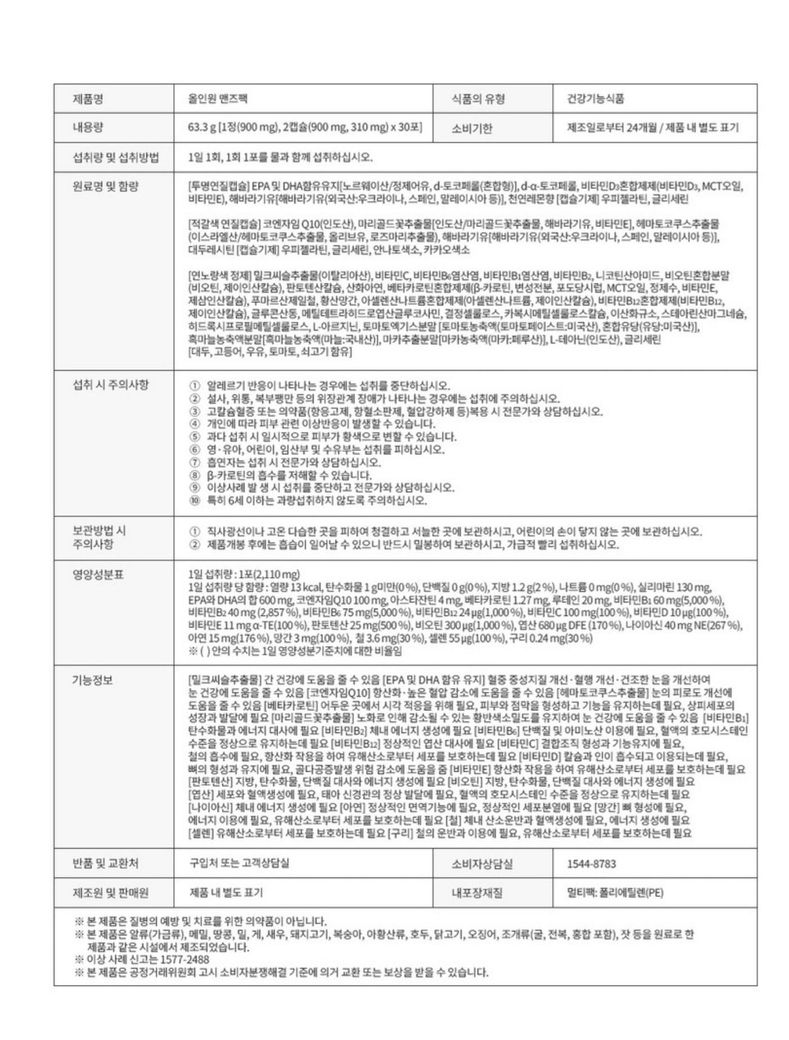 커큐민정 2알, 흑마늘즙 2포, 리포데이 올인원 맨즈팩 1포, 비아노스맥스 2알, 노즈픽션 1포