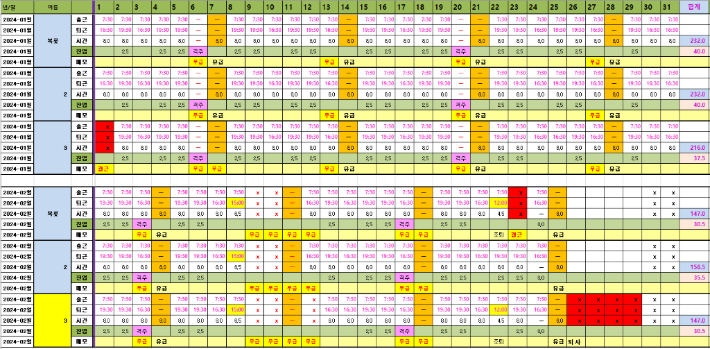 1월은 232시간 근무했고, 2월은 147시간 근무했습니다.