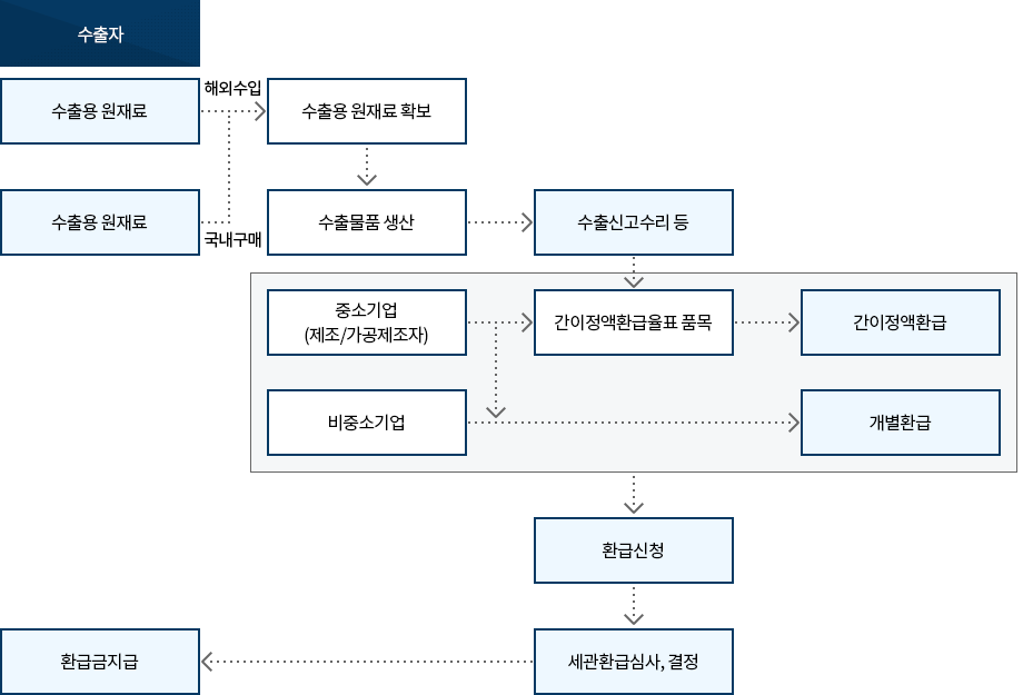 1) 개별환급은 수출제품 1단위 생산 시 수입 원재료의 소요량(투입량)에 따라 환급액을 산출하는 방법이며, 수입 원재료의 납부 관세액 및 제품 1단위 생산 시 수입 원재료의 소요량을 토대로 환급이 가능합니다.