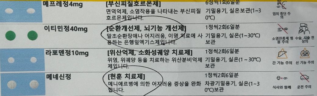 2. [사진첨부] A병원에서는 <메프레정4mg+이티민정40mg+라포덴정10mg+메네신정>, B병원에서는 <소론도정+휴온스시메틴정200+스티렌정> 이렇게 처방받았는데요. B병원에서는 몸무게에 따라 약 용량을 다르게 해야 한다고 해서 제가 46~48키로 된다고 알려드렸어요. A병원에서는 그런 말은 없었구요. A병원은 메니에르병 가능성이 아예 없는 건 아니라고 그 약도 처방해주셨어요.