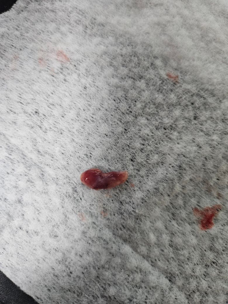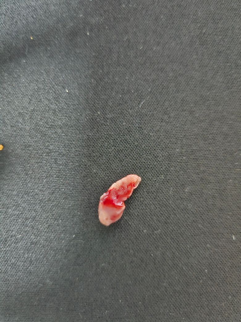 사랑니를 뺀지는 2년정도 됬는데 갑자기 어느순간 혀로 어금니쪽에 누를때 말랑말랑한 무슨 물체가 계속 자라나는거 같더니 치과 예약일이 아직 남아서 집에서 밥먹다가 어금니에 씹혀서 잘렸는데 이게 뭘까요 ...
