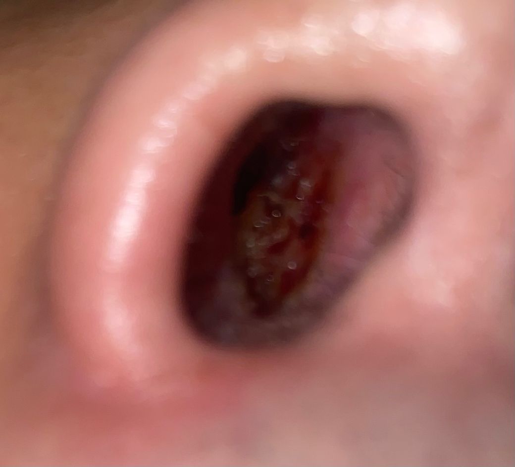 진물이랑 피가 떡진것으로 보이는데 함부로 떼었다가 코피가 많이 날 수 있으니 일단은 건드리지 마시고 이비인후과에 방문하셔서 제거하시는게 안전하겠습니다. 참고하시기 바랍니다.