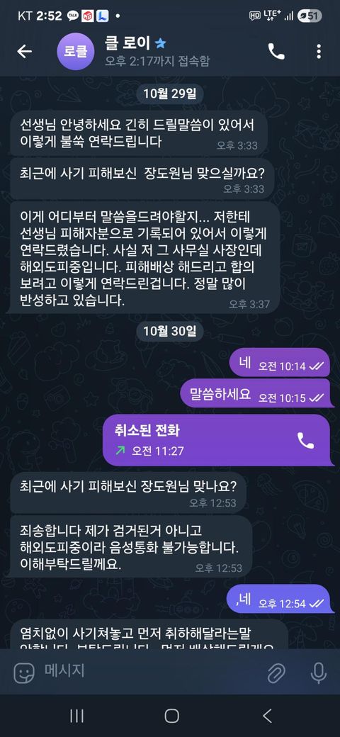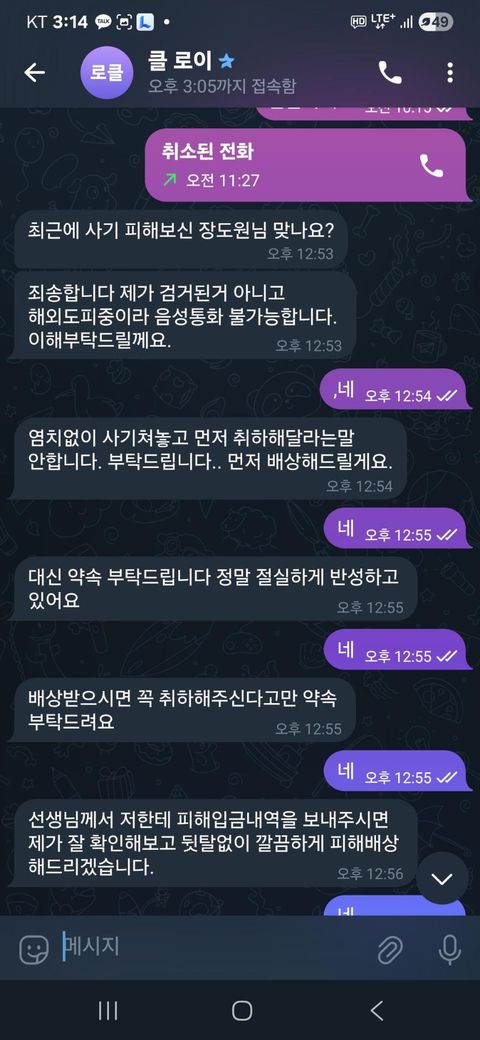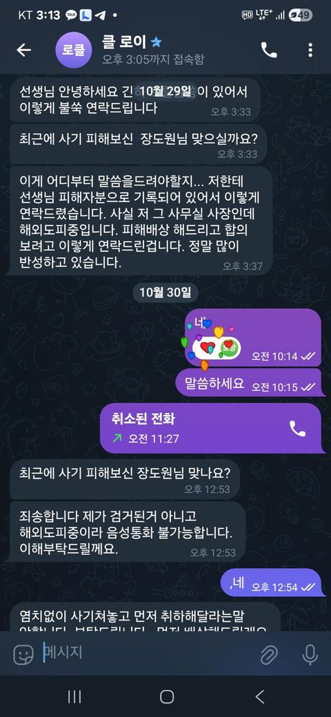 히나 잇는건 대포통장에 엮임건대 텔레그램애 연락이 와잇드라고요 피해금약보상 해쥰다고 연럭왓는대 제이름도 알고 그래서 피해금액 확인시켜주면 확인휴 송금 해준다는대 대포통쟝은 제갸 피의자로 조샤 받고 잇는대 신기하게 제이름도 정확히 알고 사기당햠것도 알고 합의흘 해달라는대뭔지 모르겟네요