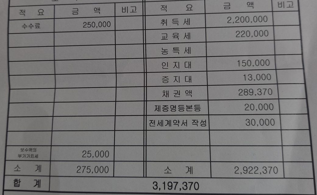 합산한 세액을 등록세란에, 법무대행비는 법무사 비용란에, 취득시
