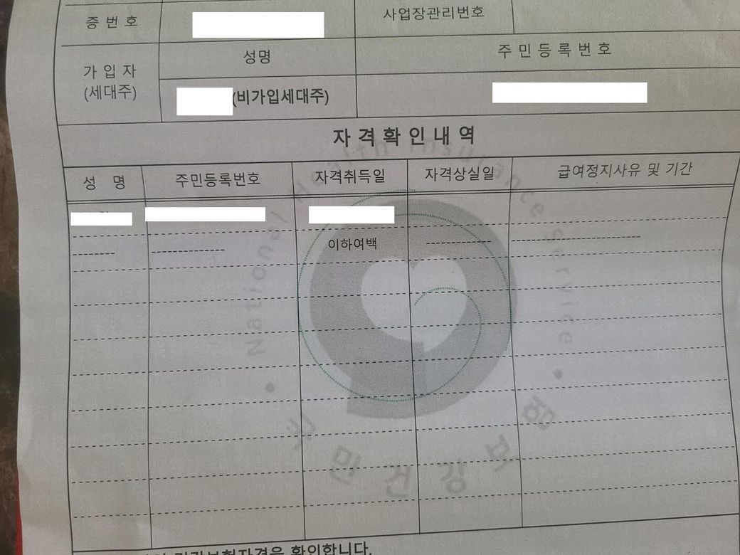가입자 세대주(아버지)비가입세대주로 되어있고, 저는 자격취득일 있고 자격상실일은 빈칸인데요.