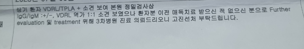 안녕하세요. 채홍석 의사입니다. 매독에 걸린 적은 있지만 최근은 아닌 잠복기감염이 의심되는 상태이며 자세한 검사를 위하여 상급병원이 권유된 상태입니다