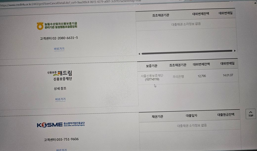 14년에 남편이 개인회생 하면서 우리은행에서 1600만원 전세대출받았던 것도 함께 대위변제 받았어요. (19년5월26일 끝남) 세대주가 저이지만 23년 11월 퇴사자이고 남편은 프리랜서라 소득 확인이 어렵습니다 . 신용점수는 나이스에서870정도 입니다.(둘다) 남편은 신용카드 1개.자동차 할부구입. 저는 카드4개. 대출금 300 만원.카드실적때문에 카드1개에 100만원정도 청구되구요! 어떤 신용거래에도 문제된적 없었습니다.하지만 이사를 가야해서 버팀목 신청을 하는데 배우자때문에 부적격이라고... 확인해보니 우리은행 대출금 1600 만원이 뜨더타구요~~ 올린 사진처럼 신용보증재단이라고 되있어서 전화했습니다. 관리종결이고 자연채무가 뜨는거라고 하시는데 이런 경우 어떻게 처리해야되나요~저렴한 이자의 보증기관을 언제까지 사용 못하는건가요? 평생 우리은행 빚진자로 살아야 되는건지..궁금합니다ㅠㅜ 해결책은 없는건가요
