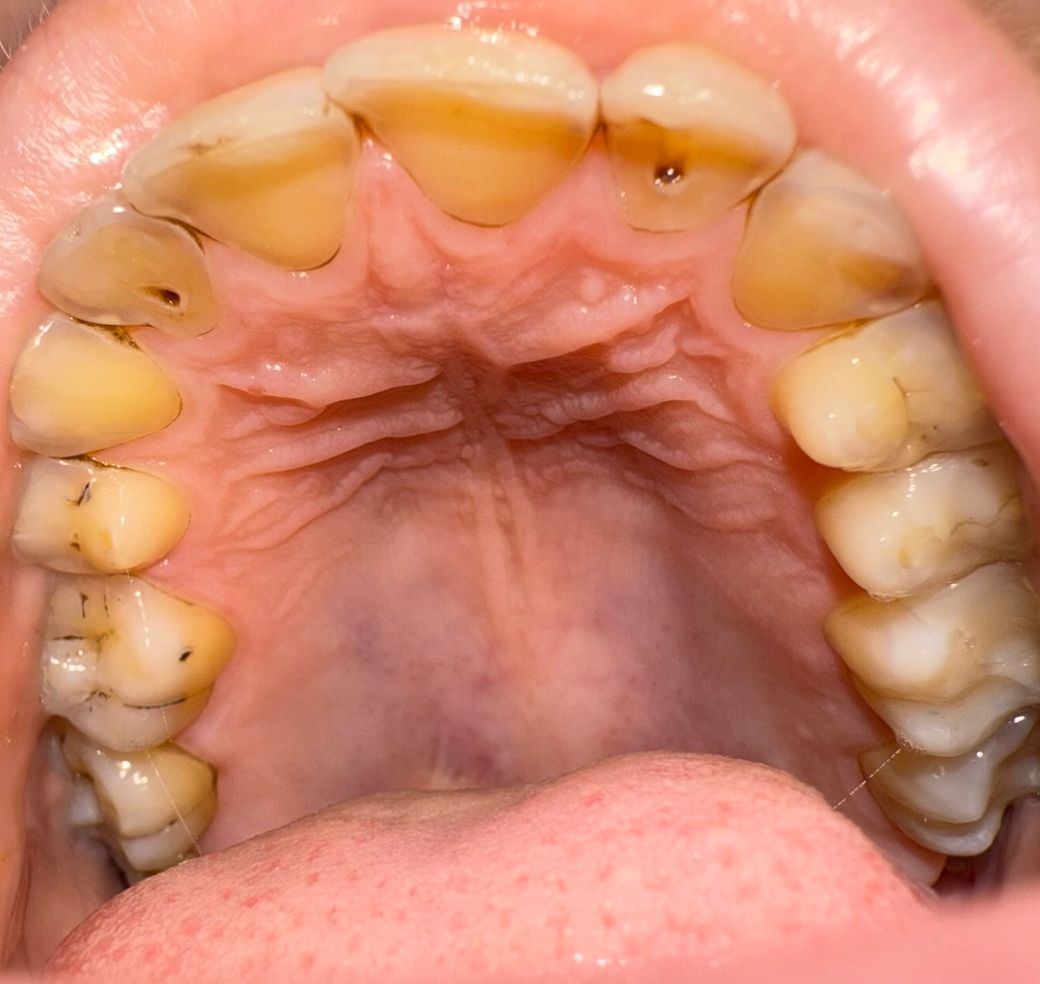 치아의 전반적인 충치가 보입니다. 우선 충치 치료를 해야 될 것으로 보입니다. 치아의 설면이 마모가 많이 되어 있는 듯 보입니다. 경우에 따라서는 크라운과 같은 보철치료를 해야 할 수 있습니다.