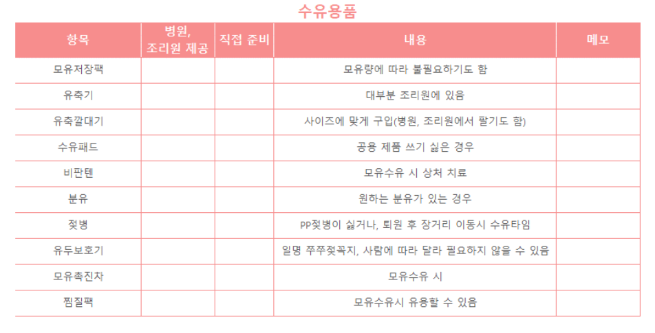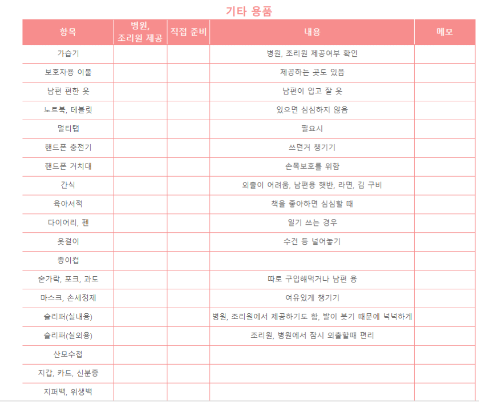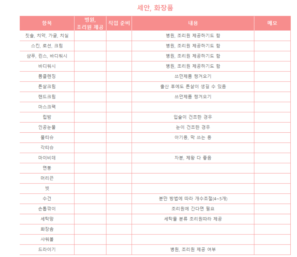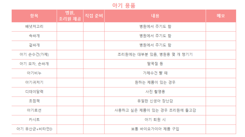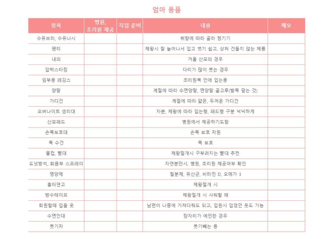 출산가방에 준비해야 할 목록은 아래와 같으니 참조하시기 바랍니다.