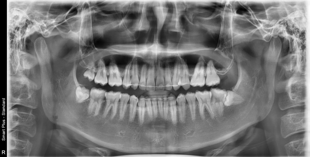 사진상 오른쪽이 실제로는 왼쪽입니다. 왼쪽 어금니 뿌리가 약간 굽어있는 것은 큰 문제는 없습니다만 사랑니가 두번째 어금니에 매우 근접해 있었기 때문에 사랑니 발치 시 좀 더 해상도가 높은 x-ray를 찍어 충치여부를 검사해보면 좋을 것 같습니다.