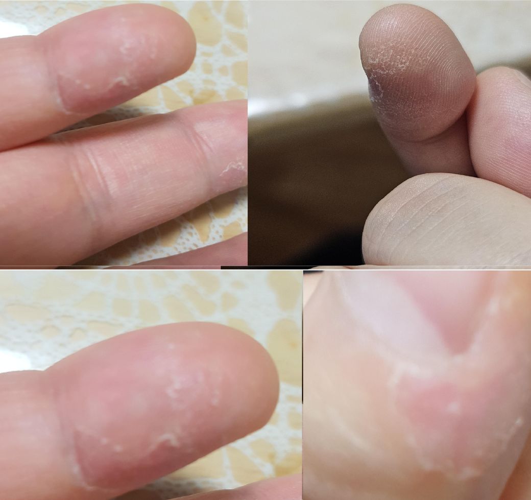 손씻었을때나 로션 약 발랐을땐 손가락 피부 벗겨진게 안보이는데 또 건조 해 지면 보이더라고요
