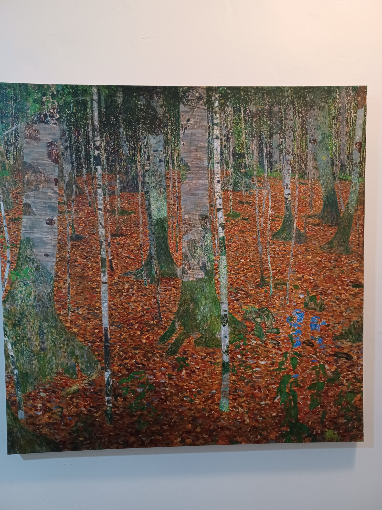 안녕하세요. 손용준 인문·예술전문가입니다. 이 그림은 구스타프 클림트의 1903년 작품인 < 자작 나무 숲> 이라는 작품 입니다. 현재 오스트리아 빈 박물관에 전시되어 있습니다. 자작나무 특유의 가로줄 무늬 수피가 드러나있고, 어지럽게 깔린 낙엽이 공을 많이 들인 ㄴ낌이구요. 원경으로 옮겨갈수록 빽빽하게 들어차고 서늘해 보이는 자작나무 숲은 마치 벽이 있는 듯 한 느낌도 듭니다.
